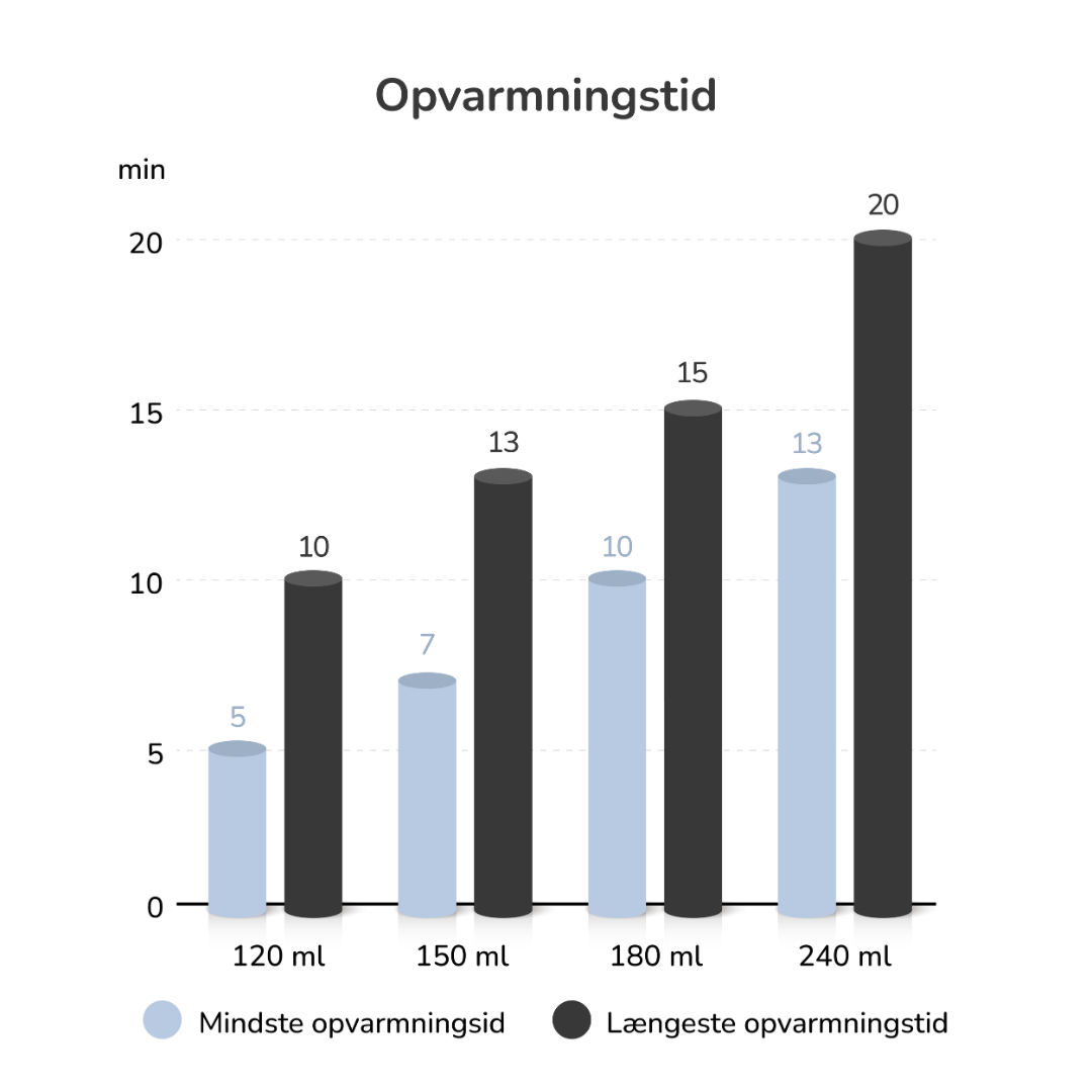 Opvarmningstiden varierer afhængigt af mængden af mælk og den valgte temperaturindstilling. Du kan forvente, at mælken er perfekt opvarmet på mellem 5 og 20 minutter.
