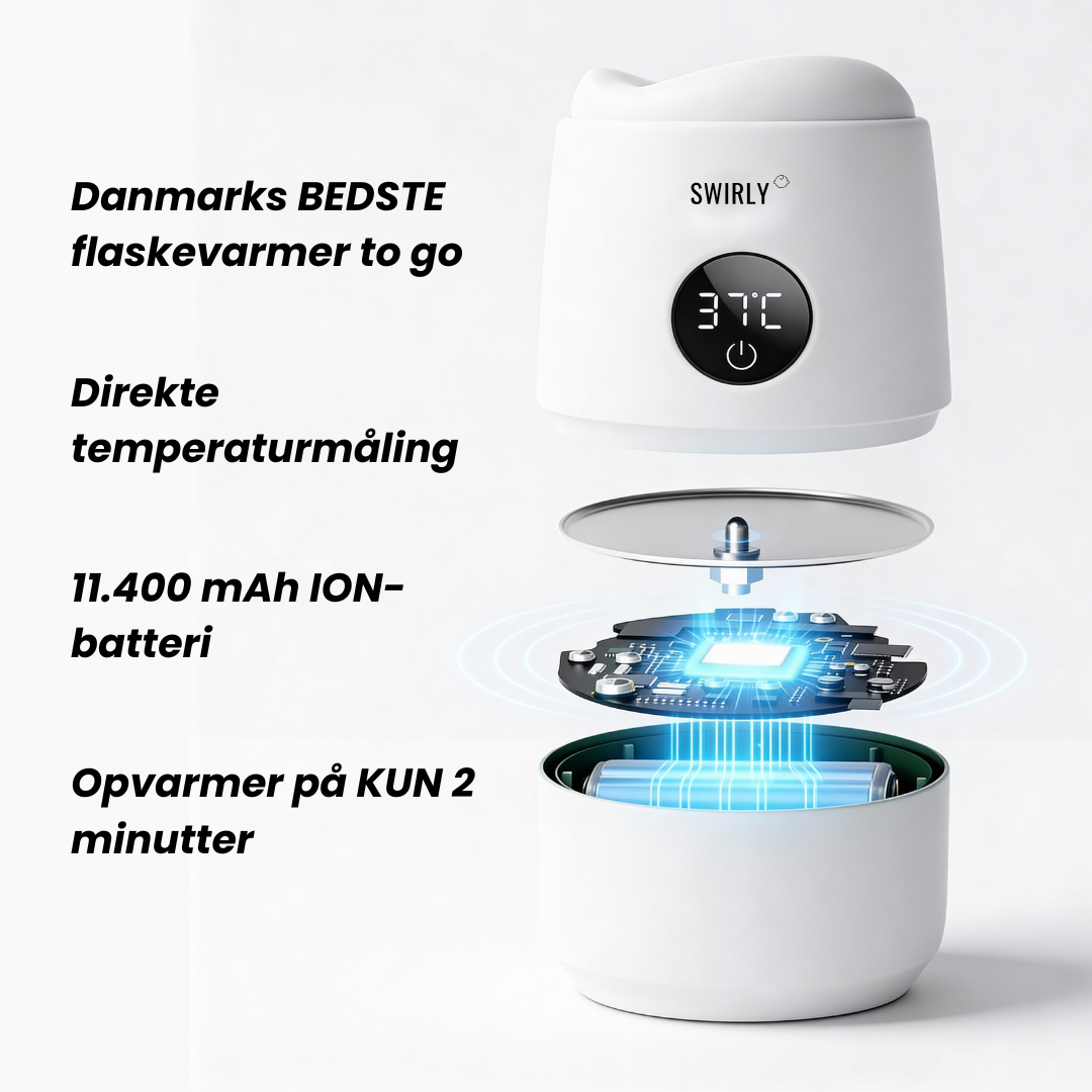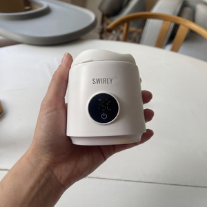 Swirly Pro er designet til travle øjeblikke, hvor du bare har brug for, at flasken bliver varm – uden bøvl. Den har et stærkere batteri, et klart LED-display og varmer mælk på få minutter (afhængigt af mængde og væske).