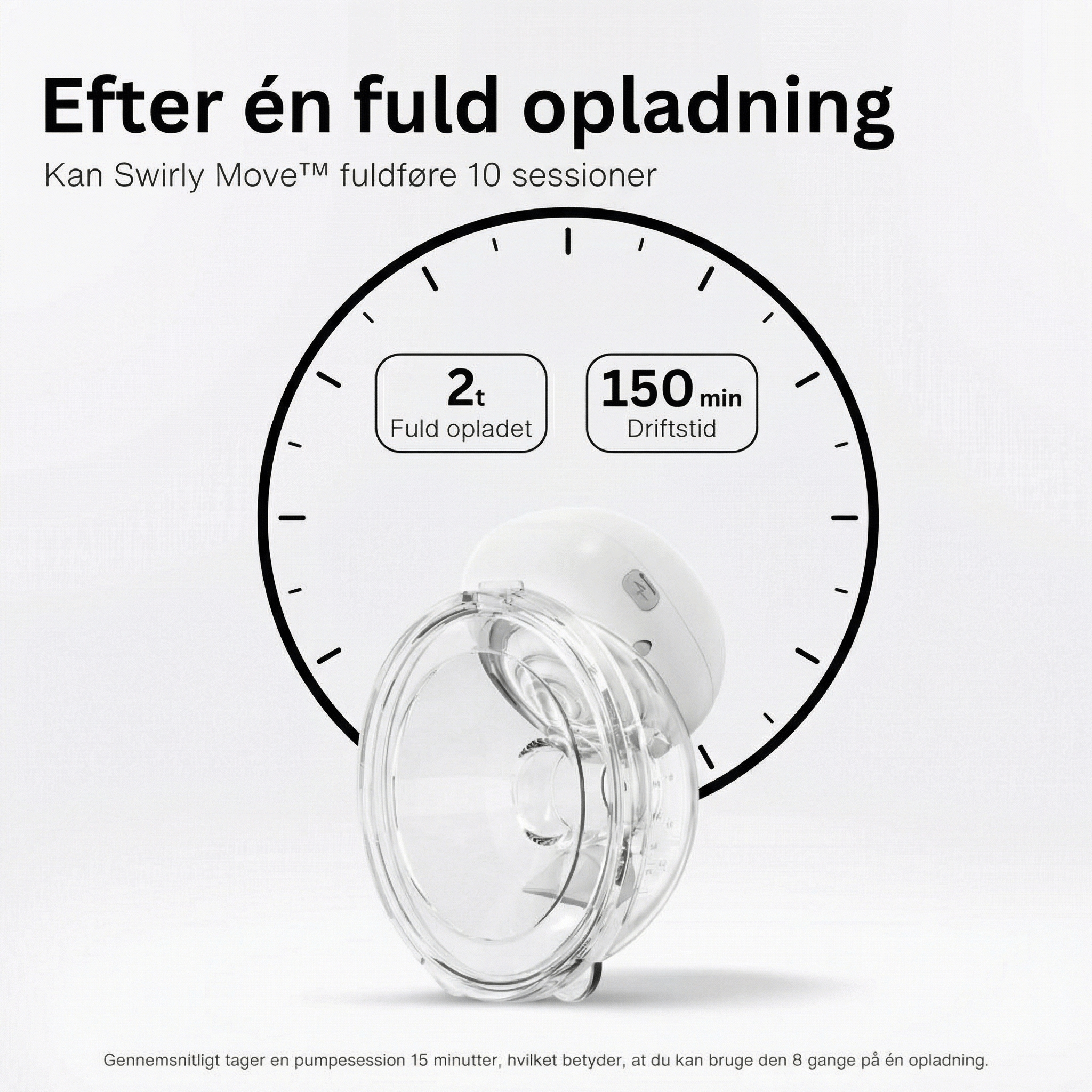 Swirly Move™ er udstyret med et kraftigt 1200mAh batteri, som er større end de fleste andre brystpumper på markedet, hvilket sikrer en længere brugstid på en enkelt opladning. Med op til 150 minutters brug, svarende til cirka 10 pumpesessioner, kan du pumpe uden bekymringer om batterilevetiden.